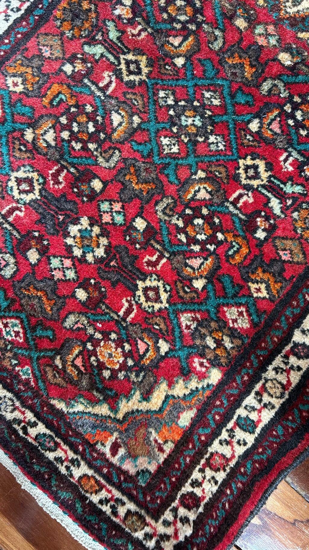 Pequeno no tamanho, grandioso no impacto: este tapete persa Heriz encanta com seu vermelho rubi profundo, ladeado por verdes e azuis em desenho floral estilizado, típico do noroeste iraniano. Tecido à mão em lã espessa e brilhante, seu medalhão central e moldura de bordas simétricas criam um efeito de equilíbrio e nobreza.