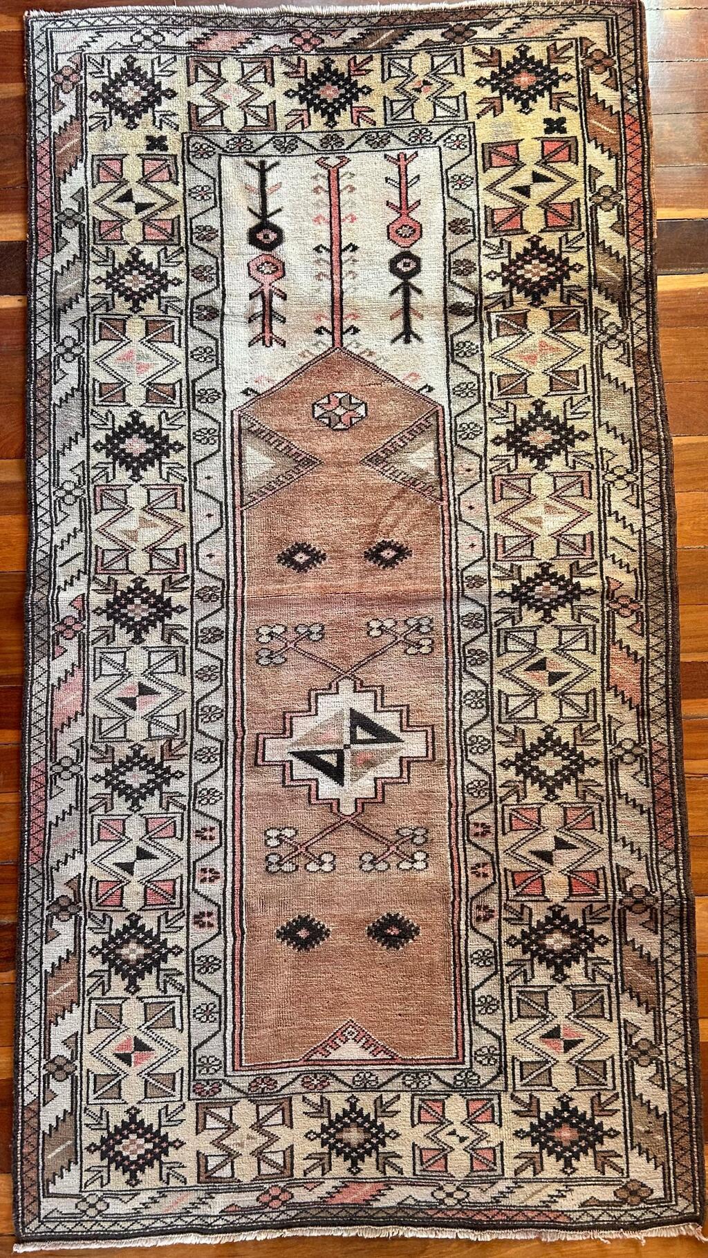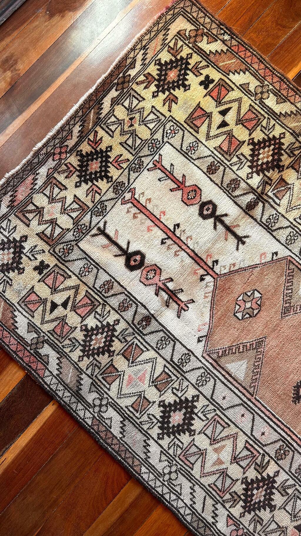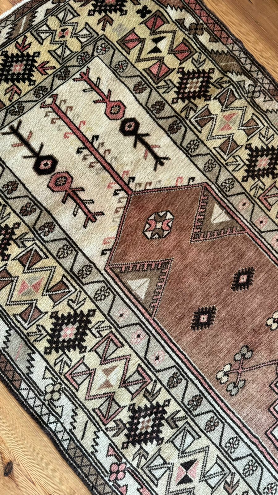 Com fundo terroso e desenhos geométricos em preto, cru e toques de rosa antigo, este tapete exibe a elegância rústica dos teares tribais. No centro, um medalhão estilizado atrai o olhar com sua assimetria quase hipnótica, cercado por formas que evocam estrelas e flores primitivas.